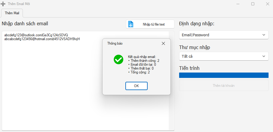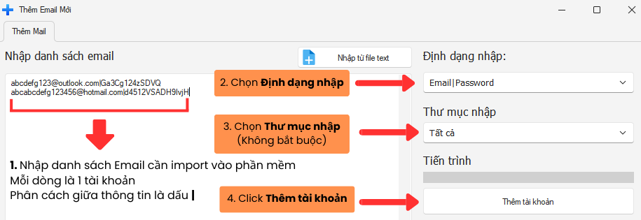 Nhập danh sách tài khoản email bạn muốn thêm, mỗi dòng là 1 tài khoản